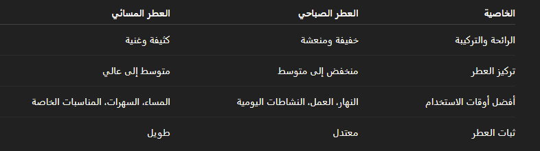 عادةً ما يكون العطر الصباحي بتركيز أخف أو بتركيبة منعشة حتى لا يكون مزعجًا في بيئة العمل أو خلال النهار، في المقابل يمكن أن يكون العطر المسائي بتركيز أعلى ليمنح فوحانًا وثباتًا أطول يناسب السهرات والمناسبات.